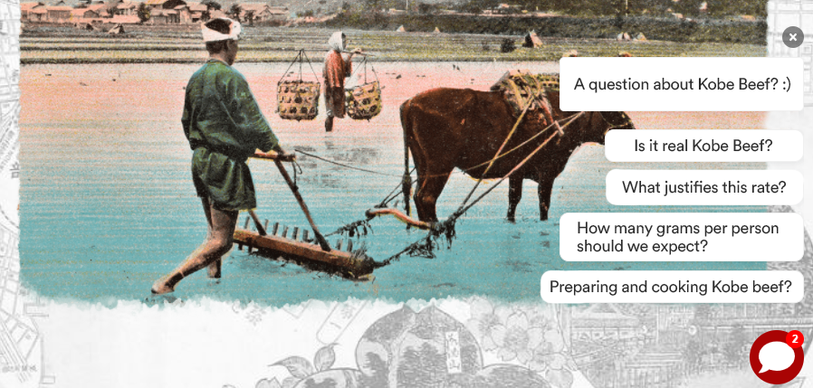 Using triggers (small notification bubbles displayed by the virtual agent), the company can attract visitors’ attention and engage in a personalized conversation with each of them. The company can customize these triggers according to the page which customers visit. For example, when a visitor arrives on the Kobe Beef page, triggers are activated after a few seconds. The triggers allow the visitor to quickly access all the information (preparation, cooking, origin, etc.) about the product.