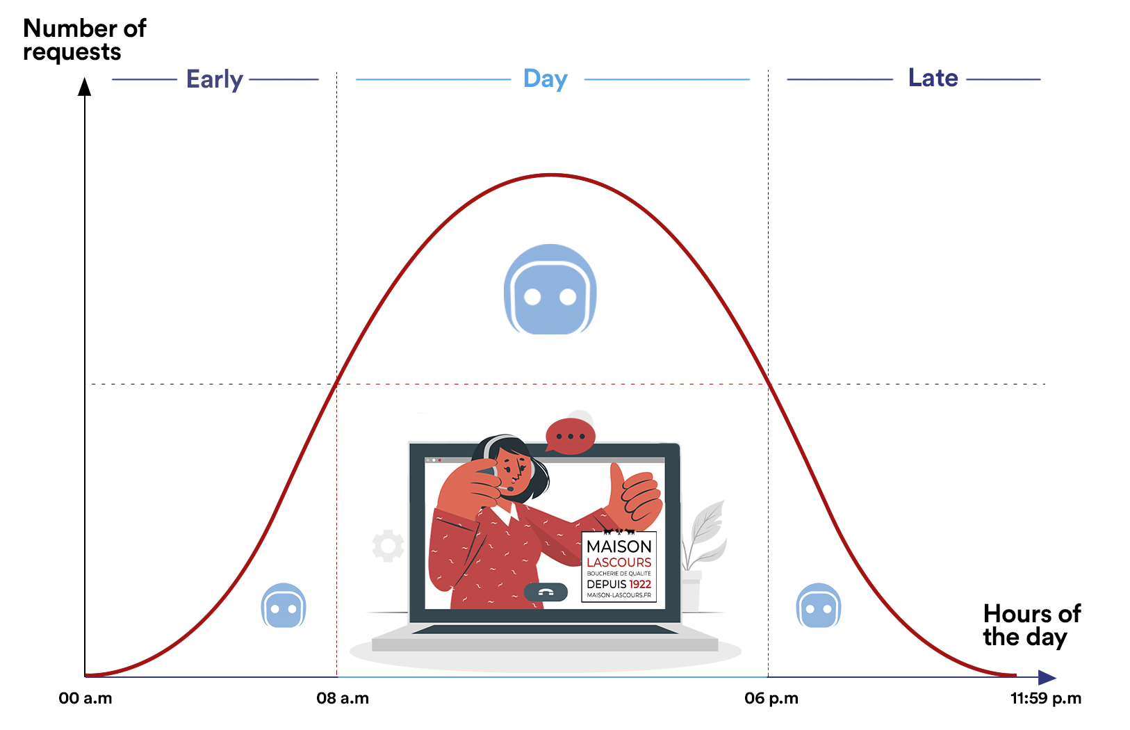 Integrating the Botmind virtual agent and handling the tool for the Maison Lascours team was quick and easy. In two weeks, the virtual agent (hybrid chatbot) was operational and could automatically answer over 60 frequent and time-consuming questions such as, “What are your delivery methods?” and “What are your opening hours?” The virtual agent filters basic questions and allows customer service representatives to deal with high value-added requests effectively.