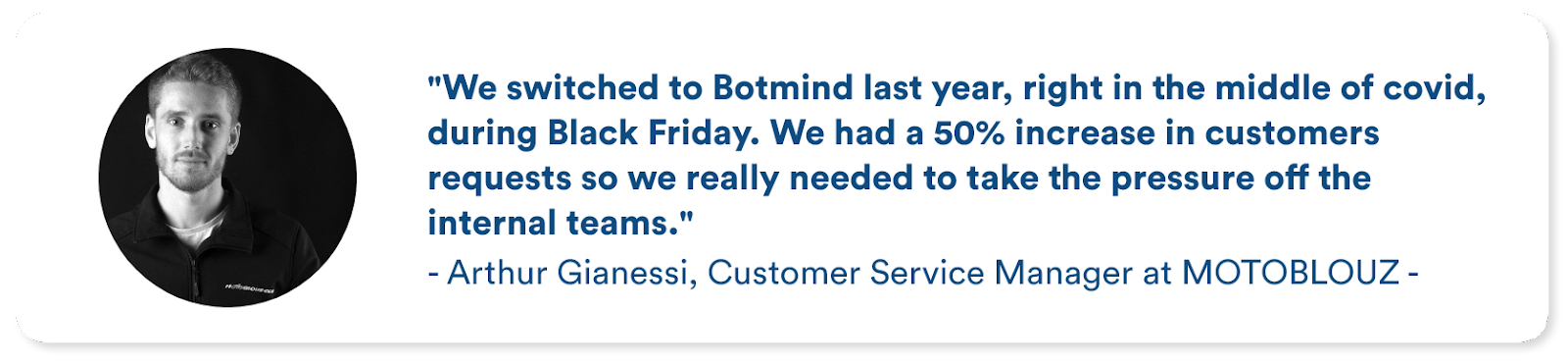As we all know, requests for assistance are just as diverse as the customers. From the biker looking forward to his next weekend ride to the one who prefers to take time to ‘perfect’ his motorcycle, each rider has his unique habits and needs. Since the health crisis and increase in telecommuting, Motoblouz's historical peaks of activity have changed. The Customer Service Department now receives over 350 calls during the Monday and Friday peak times. Customer inquiries range from “Do you accept PayPal payments?” to “Which leather jacket lining should I use this winter?” With such an influx of inquiries, customer support required a solution that could provide answers to frequent and time-consuming questions in an automated yet reasonable manner while allowing customer support to focus on high-value-added requests. This is where Motoblouz discovered Botmind.