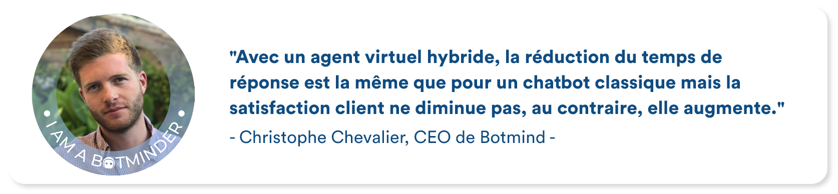 De plus, le chatbot classique est souvent mal perçu par les clients qui dialoguent avec un “robot” alors que l’agent virtuel hybride est personnalisable et fait partie intégrante de l’équipe support. Il tire profit de l’existence d’humains sur le même canal de chat et est ainsi perçu de manière positive par les clients. L’agent virtuel hybride se présente comme le futur de la relation client et améliore l’expérience sur les sites e-commerce.