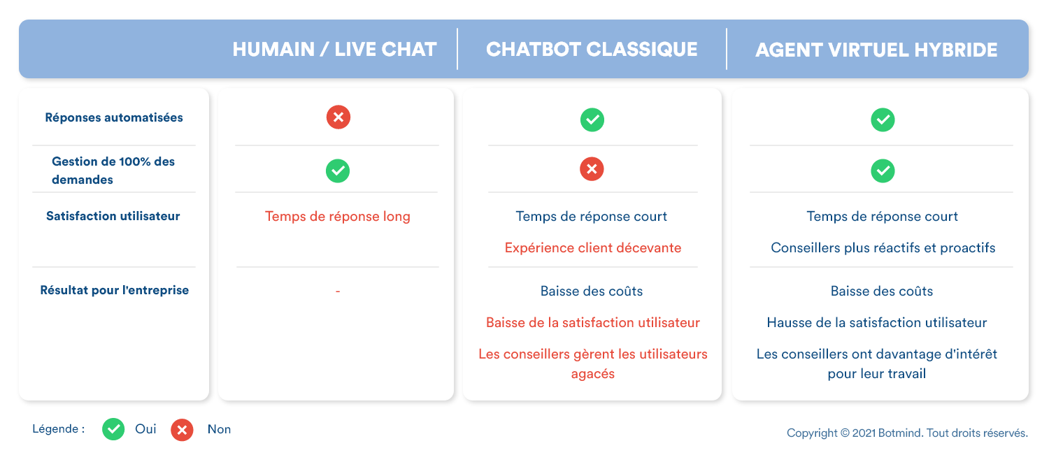 Qu’il s’agisse du chatbot classique ou de l’agent virtuel hybride, les deux solutions permettent d’automatiser le support client dans l’e-commerce. Cependant, le chatbot ne comprend pas toutes les demandes et peut donc donner une réponse incohérente. Avec l’agent virtuel hybride, le client est toujours satisfait car il obtient obligatoirement une réponse. En effet, si l’agent virtuel hybride comprend la demande, il peut lui répondre de manière automatique et fait gagner du temps aux conseillers du support. Mais, s’il ne comprend pas la demande, celle-ci est redirigée vers un conseiller plus apte à y répondre. Le client reçoit donc toujours une réponse pertinente et personnalisée quelle que soit sa demande.