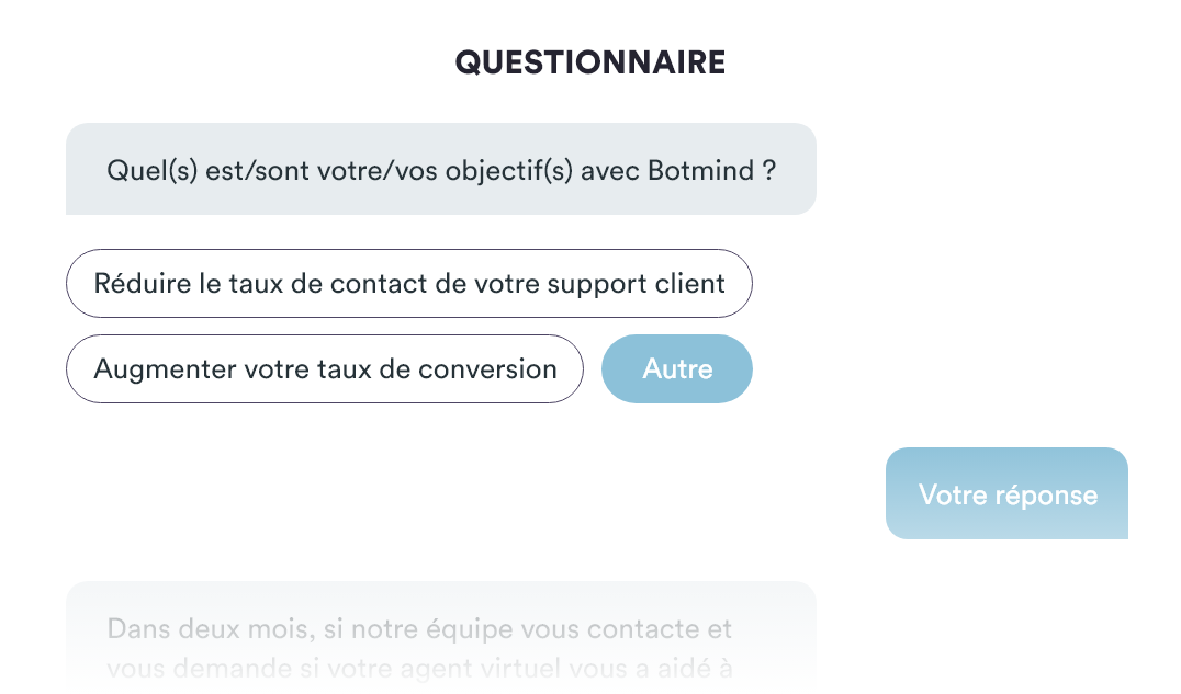 Pour un onboarding optimal, nous devons d'abord vous connaître. Prenez donc quelques minutes pour remplir le questionnaire que nous vous envoyons. Cela nous permettra de comprendre vos objectifs, l'organisation de votre support client, votre outil de ticketing, de tracking.