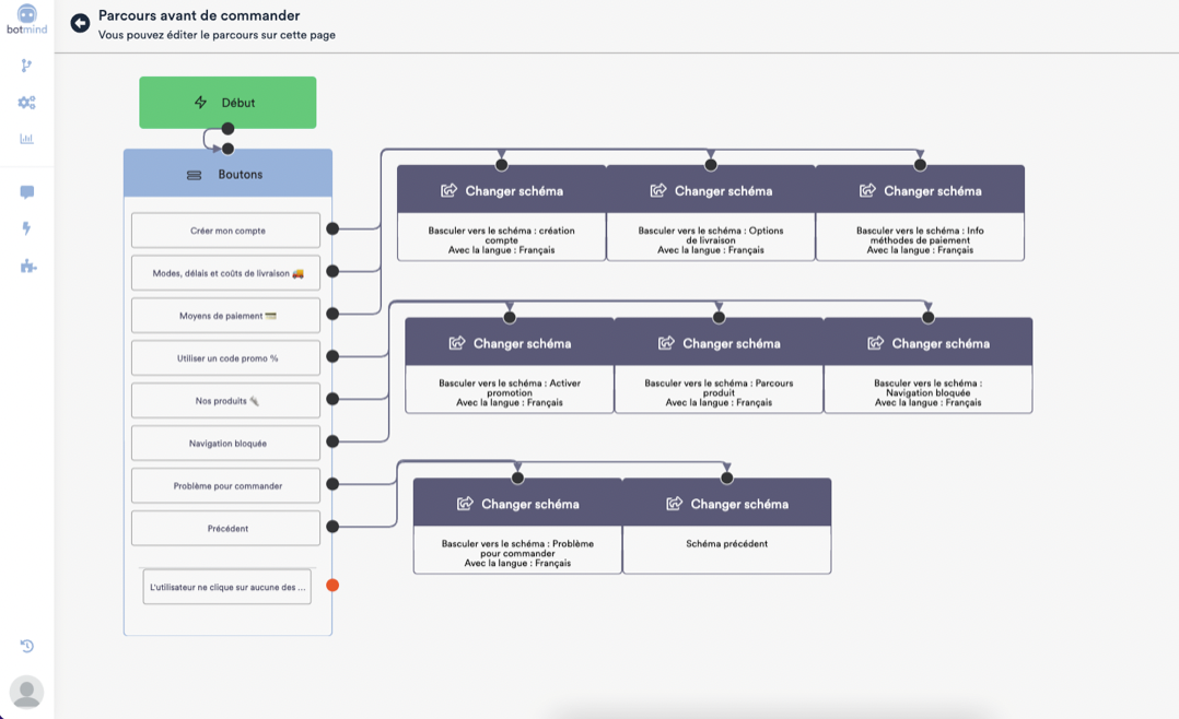 Cette étape est cruciale dans la configuration de votre chatbot. Elle vous permet de classifier les différentes questions que vous souhaitez automatiser. Répertoriez toutes les questions, sujets et thèmes fréquents que vous souhaitez automatiser. Classez-les ensuite en différentes catégories. Botmind offre une catégorisation standard (livraison, commandes, système, marketplace, paiement, etc.) pour faciliter la mise en place de votre chatbot, mais vous pouvez aussi créer des catégories personnalisées à votre activité. Personnalisez également vos réponses selon le ton de votre communication habituelle.