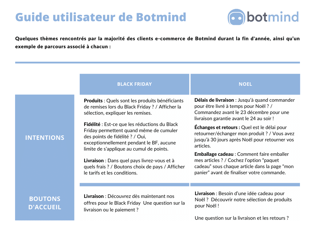 Découvrez comment Botmind, votre outil SaaS innovant, peut optimiser votre service client pendant les périodes cruciales de Black Friday et Noël. Apprenez à préparer votre chatbot pour des performances optimales en réponse aux demandes clients en constante augmentation.Nous allons explorer l’aspect support de votre utilisation de Botmind. Le but est que vous soyez totalement prêt à affronter cette période charnière qu’est la fin d’année. En parcourant ce guide, vous verrez de nombreux conseils, très utiles tout au long de l’année, mais particulièrement pendant les différentes périodes que vous allez connaître en fin d’année, à savoir :