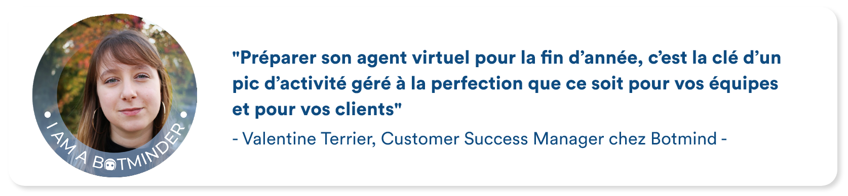 - Le Black Friday suivi du Cyber Monday : les 27 et 30 novembre cette année, mais nous vous conseillons de préparer votre agent virtuel à répondre dès le 23 novembre aux questions relatives.