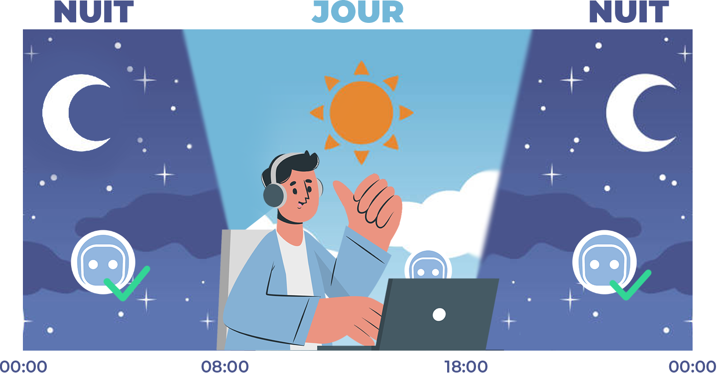 L’agent conversationnel est programmé pour pouvoir répondre à tous les clients et à tout moment. Il saura satisfaire tous vos clients, même les plus couche-tard. Créer un chatbot sur son site e-commerce permet de soulager le support client à son arrivée le matin car il traite les demandes même la nuit et désengorge le nombre de demandes.