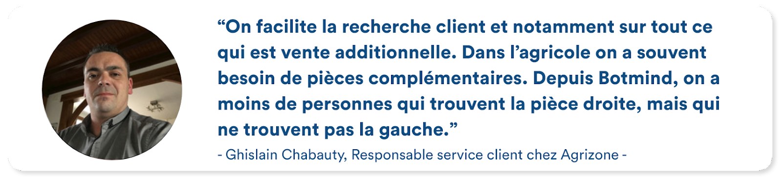 Le site Agrizone propose une large gamme de produits spécialisés parmi plus de 280 000 références. Leur agent conversationnel a été configuré de telle sorte à ce qu’il puisse conseiller sur les produits complémentaires, améliorant la fidélisation. Pari réussi : le parcours le plus utilisé est celui relatif à “je cherche un produit”.
