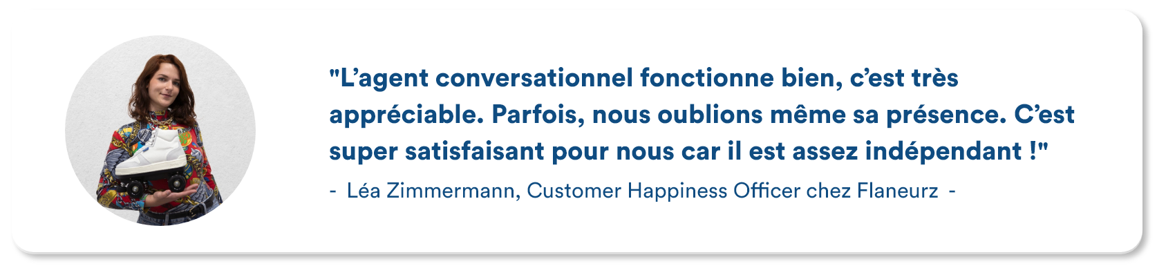 L’intégration de l’agent conversationnel avec les autres outils de Flaneurz (comme avec leur plateforme de support client Zendesk) s’est faite de manière rapide et simple. Le dashboard, très intuitif, est fortement apprécié par l’équipe support client de l’entreprise. Les statistiques leur permettent d’avoir une vision globale de ce qu’il se passe sur leur site. L’agent conversationnel fait désormais partie intégrante de l’équipe Flaneurz ! Il est véritablement considéré comme un troisième conseiller et vient compléter l’équipe support client formée de Léa et d’Inès, qui sont ravies d’avoir un nouveau collègue virtuel aussi performant qu’indépendant !