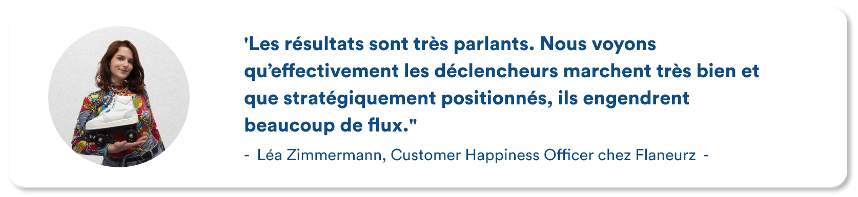 Lorsqu’un client arrive sur la page de paiement, les déclencheurs sont là pour les accompagner et répondre à leurs questions. Ils permettent à l’entreprise de raccourcir le tunnel de vente et de booster le taux de conversion. Grâce à l’intégration de déclencheurs, Flaneurz est capable d’apporter un accompagnement personnalisé et instantané à ses clients afin de faciliter leur parcours d’achat.