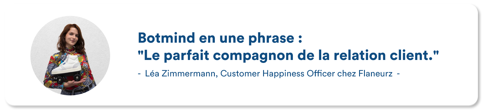 Les points réguliers avec l’équipe Customer Success de Botmind permettent à Flaneurz de suivre et d’analyser les performances de l’agent conversationnel. C’est aussi le moment pour discuter d’éventuelles nouveautés afin d’optimiser encore plus l’utilisation de Botmind.