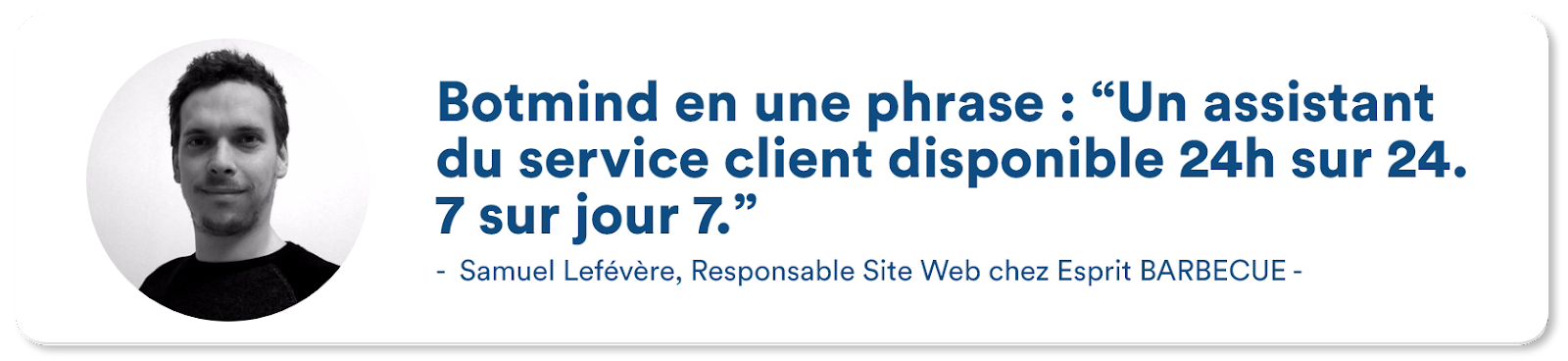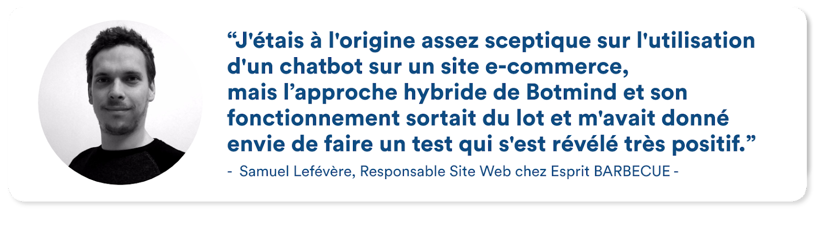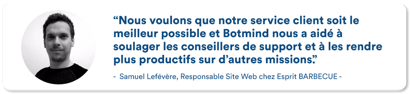 Malgré une réticence initiale face à l’utilisation des chatbots, Esprit Barbecue s’est lancé et a testé Botmind. En effet, suite à une recherche poussée, l’entreprise a été séduite par l’approche hybride de Botmind qui permet de garder l’Humain au centre de l’expérience client, mais également par son prix, qui est "juste et cohérent" par rapport aux offres concurrentes.