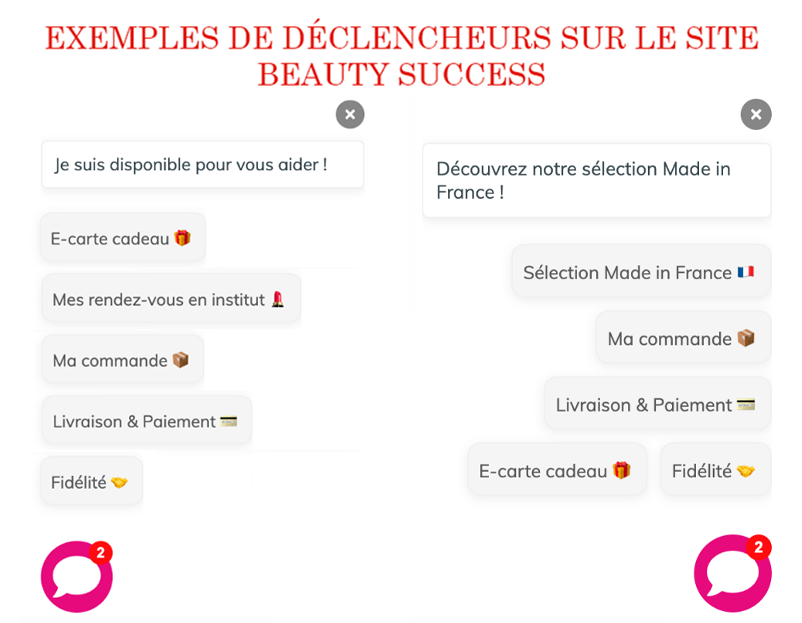 Grâce aux déclencheurs (petites notifications affichées par l’agent virtuel), l’entreprise a la possibilité de personnaliser son message selon la page visitée par le client. Par exemple, si ce dernier visite la page ‘Green Beauty’, dédiée aux marques et aux produits certifiés BIO, il peut avoir un accès rapide à une sélection de marques locales et made in France. Sur la page carte cadeau, il peut avoir un accès rapide à toutes les informations liées aux cartes cadeaux et l’agent virtuel peut l’engager dans un parcours de réponse personnalisé.
