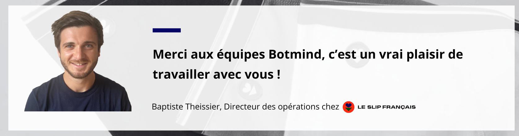 Le Slip Français a su harmoniser sa croissance rapide et sa saisonnalité marquée avec une expérience client exceptionnelle grâce à l'agent virtuel Botmind. Ce dernier a permis de gérer efficacement les demandes de service client pendant les pics d'activité, d'automatiser les requêtes fréquentes, et de libérer les agents pour se concentrer sur les demandes les plus complexes et à forte valeur ajoutée. De cette manière, Le Slip Français non seulement satisfait ses clients en leur offrant un service rapide et personnalisé, mais optimise également ses ressources internes pour une meilleure efficacité opérationnelle.