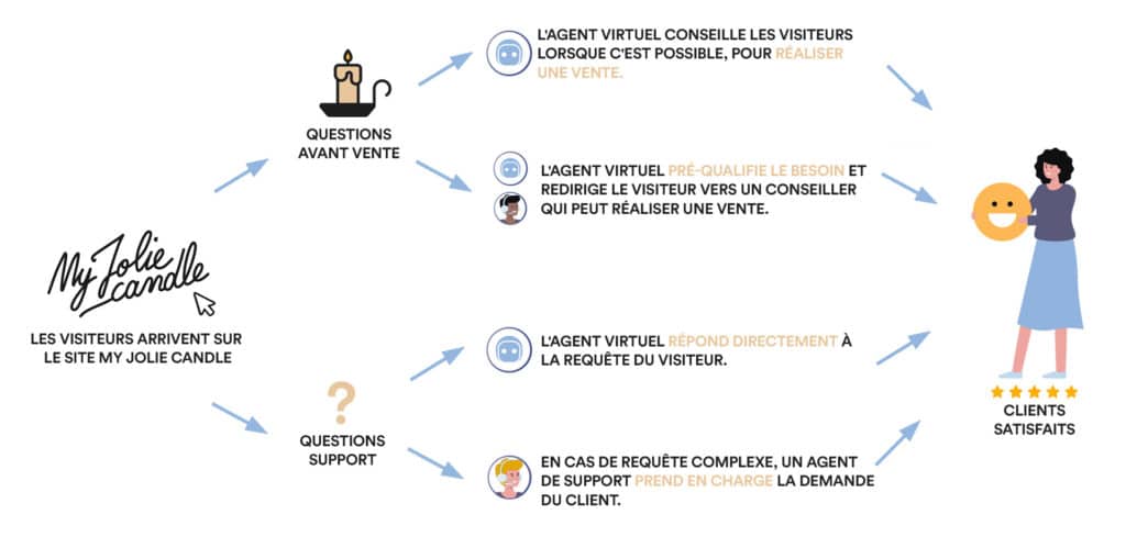 Cette tendance était d’autant plus forte lors des fêtes de fin d’année et fêtes des mères durant lesquelles de nombreuses personnes se tournaient vers la marque pour trouver une idée de cadeau tendance. La marque devait alors réfléchir à une solution efficace pour apporter une réponse sans délai à toute personne le nécessitant. Pour cela, My Jolie Candle ne souhaitait pas utiliser un bot lambda qui pouvait s’avérer mauvais pour l’image de l’entreprise. L’enjeu était d’améliorer l’expérience de ses client en apportant une véritable plus-value via l’utilisation d’une solution innovante et efficace de chat.