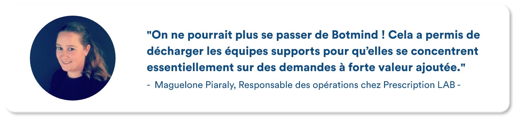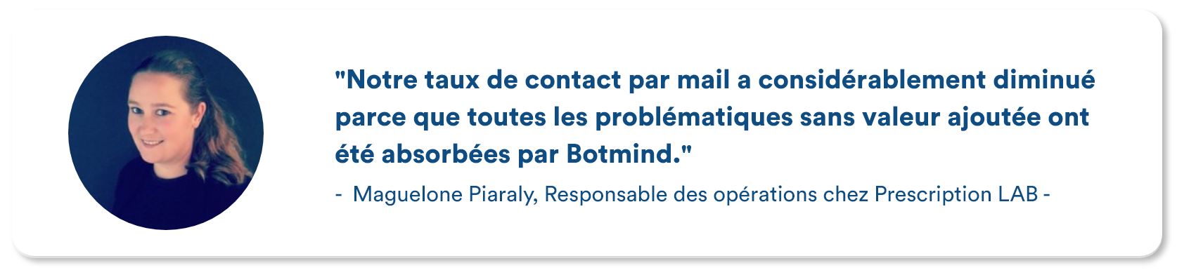 Dans les 3 mois qui suivirent l’implémentation de Botmind, une augmentation considérable de la satisfaction vis-à-vis du service client a été remarquée. Cela s’explique par l’amélioration du temps de réponse des agents par mail et de l’agent conversationnel en temps réel via le live-chat. Grâce à cette synergie entre la technologie et l’humain, Prescription Lab est capable d’apporter des réponses rapides et précises aux demandes entrantes et d’offrir une expérience client irréprochable, qu’importe le canal utilisé par les clients.
