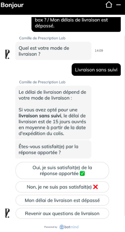 La satisfaction client a toujours été une priorité pour Prescription Lab. Mais comment la mesurer à travers l’agent conversationnel ? Des parcours spécifiques ont été créés en intégrant le NPS (Net Promoter Score) qui est l’outil qu’utilise l’entreprise pour mesurer sa satisfaction client. Des déclencheurs sont mis en place et demandent à l’utilisateur s’il a été satisfait de la réponse que lui a apportée Botmind suite à sa question posée. Les réponses au sujet de la satisfaction des visiteurs permettent alors à la marque de connaître les sujets auxquels les clients rencontrent le plus de problèmes. Prescription Lab peut ainsi modifier et adapter les parcours clients afin de répondre aux mieux aux demandes entrantes de support.