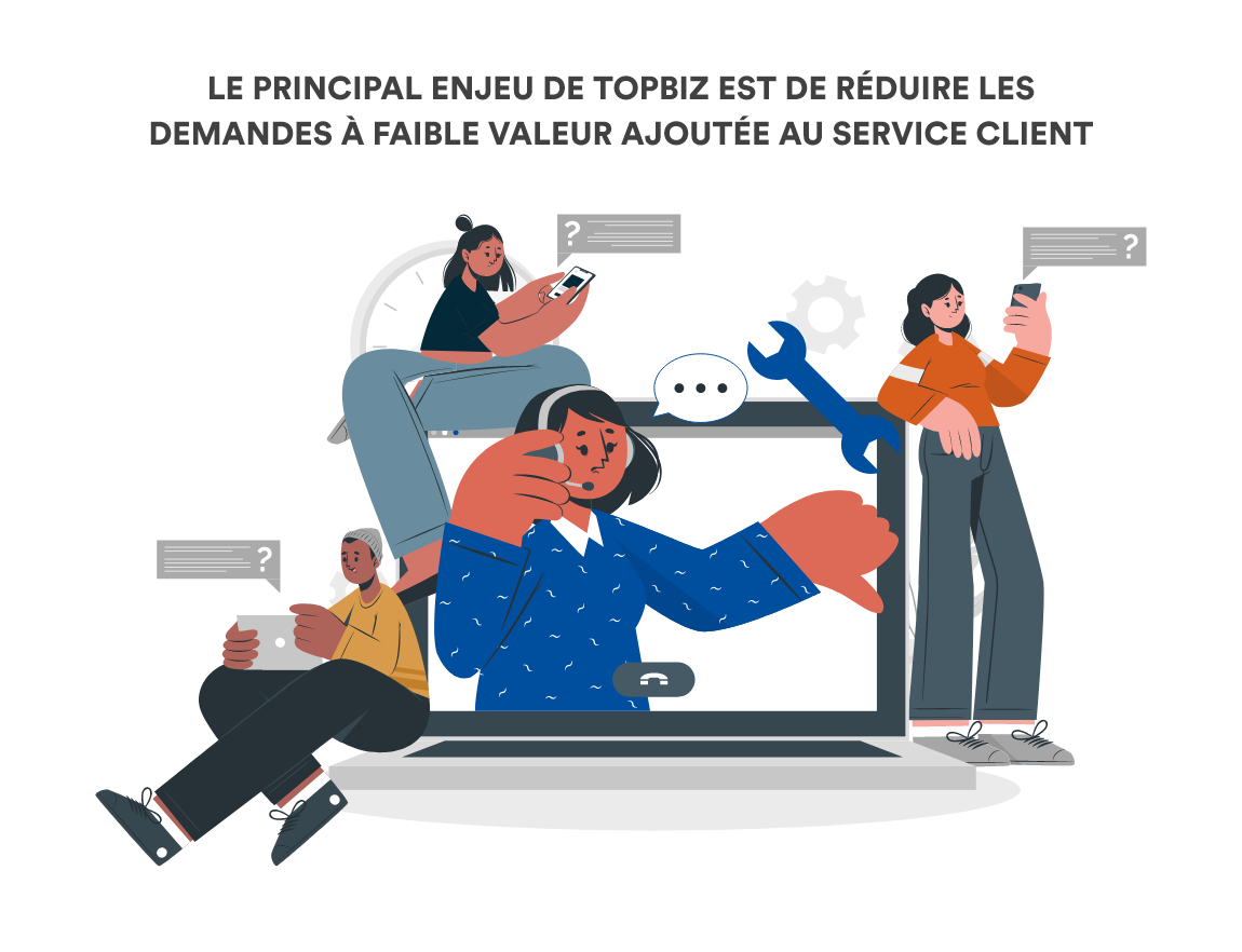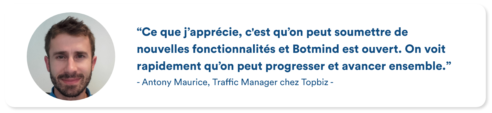 Topbiz souhaitait alléger la tâche de son support client. L’entreprise cherchait un moyen d’épauler son équipe afin qu’elle puisse se concentrer sur les questions à forte valeur ajoutée et nécessitant une intervention de ses agents. L’entreprise cherchait une solution plug and play qui ne nécessitait pas de développement, c’est pourquoi elle s’est naturellement tournée vers Botmind pour automatiser les réponses aux questions fréquentes et chronophages.