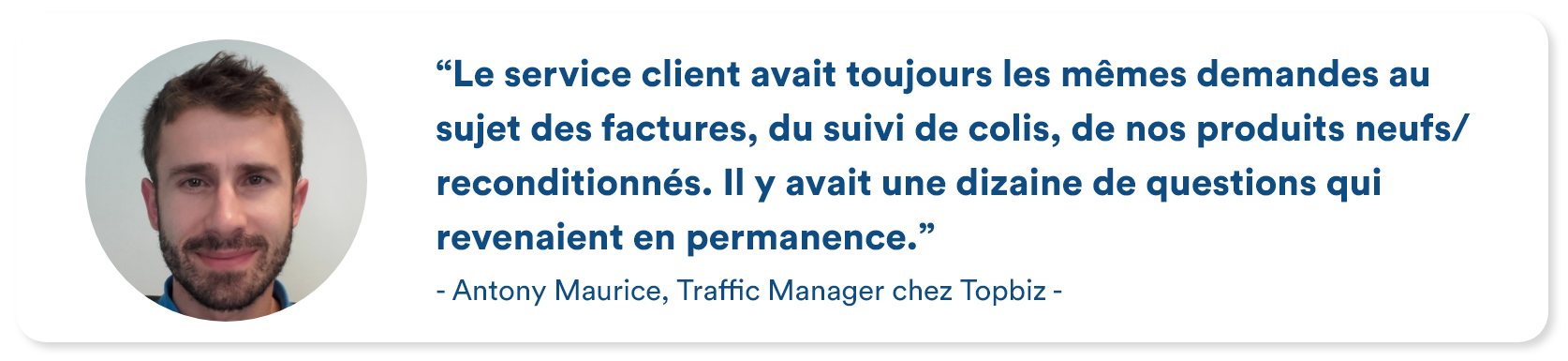 Le principal enjeu de Topbiz portait sur la réduction de demandes à faible valeur ajoutée au service client. Souhaitant garantir une expérience client irréprochable, la marque était à la recherche d’une solution permettant d’accompagner ses clients dans le parcours d’achat, tout en réduisant le nombre de demandes entrantes vers le support client.